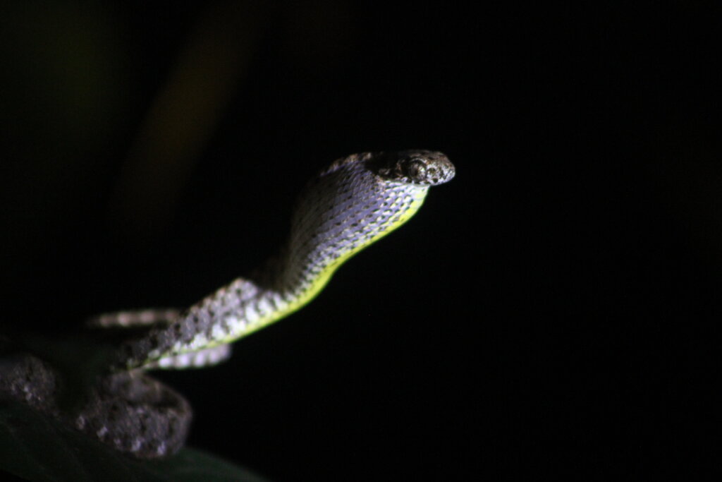 We continued on with our night safari but when we returned later in the evening, the Jasper cat snake was still there, only with an interesting development. “It must have just eaten something,” someone said, noting that the snake’s throat was stretched out in a weird way. It also started to raise its head up, up, up, up, stretching. Maybe it was trying to swallow a recent catch?