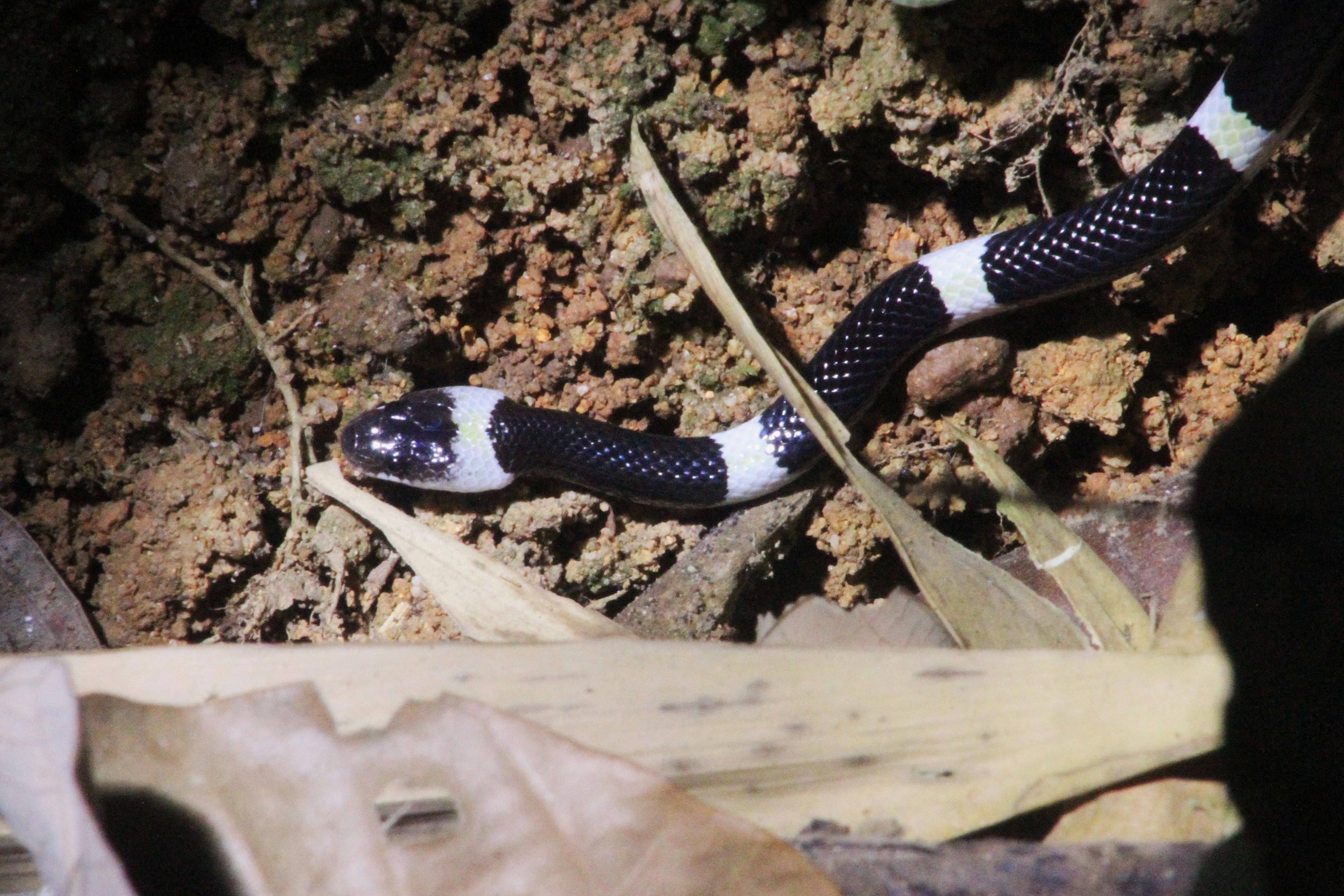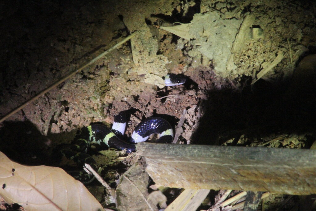 Maybe three minutes later, Green asked me if I wanted to see a snake. YES! Another group had spotted it, slithering along the edge of the trail. It was black and white and I instantly recognized it as a bridle snake, a species I’d seen once before in Cat Tien National Park.