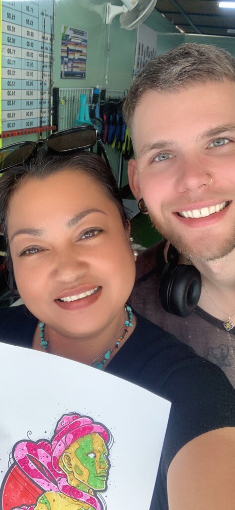 Once I returned to Koh Lipe, I grabbed my finished drawings and decided to visit all my local Koh Lipe friends. I stopped by Sin, gave him a drawing. I got a chicken pad thai and gave one to that lady. I stopped by Ying and gave her one. This was just earlier today. I will visit Madame Yoo-hoo tonight to give her one as well. One thing I thought was interesting is that everyone wanted to make sure I had signed them. C’mon, crediting the artist! (Ying also took our photo with a filter on which is why I look so good lol.)