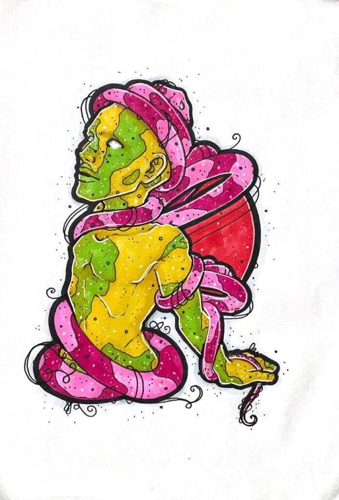 Finally, after probably two months, I managed to pump out a drawing! I like the construction of the piece but not pleased with the color combinations. I am running out of markers so my color options are a little limited. Once I get to a bigger town, I’m going to restock.