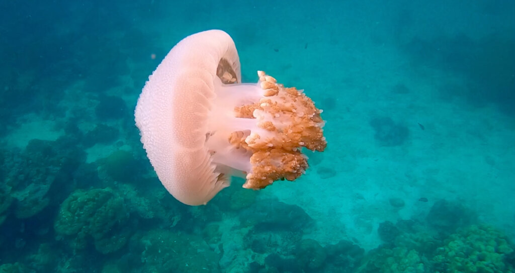 The second spot was even better, though. I saw a few Dory fish, a group of squid, and then right underneath our boat… a giant, pink jellyfish! Score! It was cute to see all the baby fish hiding underneath its bell.