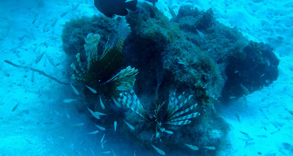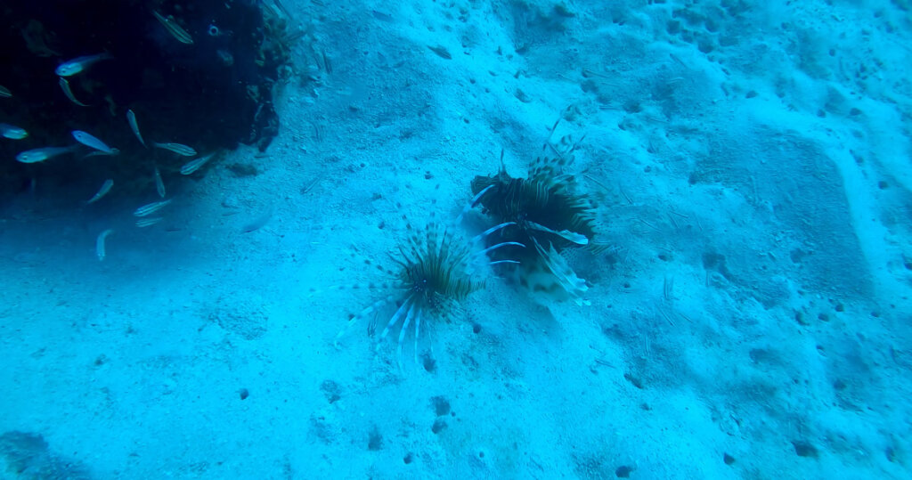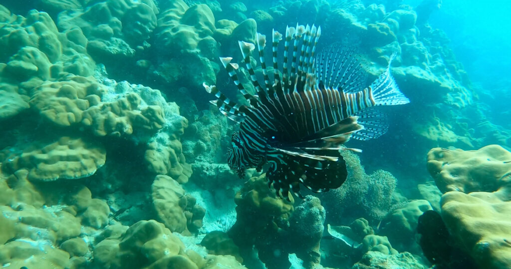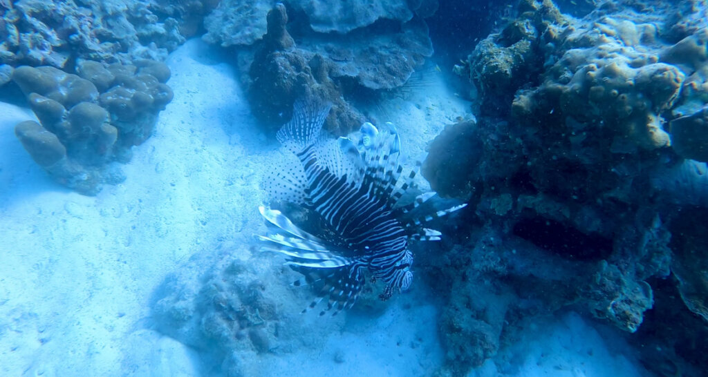 Not long after, we came across a small piece of coral surrounded by baby fish. But resting on the coral were not one, not two, but THREE lionfish. And on the sand just to the side were two more! I adore lionfish – their patterns are striking and we all know I love venomous things. These guys have venomous spines. It was so cool to see so many in one spot. I’ve only ever seen them solitary. We saw two more lionfish during that same dive. Crazy!
