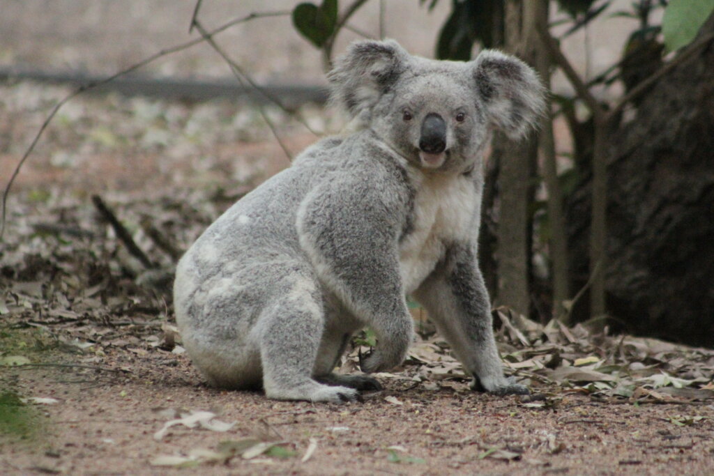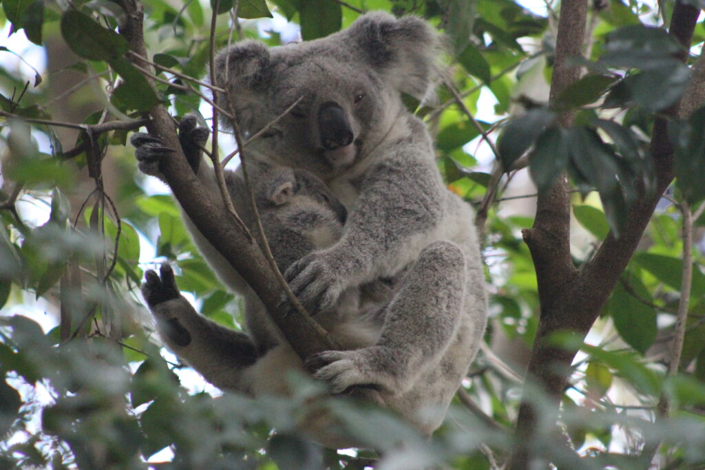 I admired the resting momma and joey for some time. I went on a walk into town but then decided to revisit the koalas and the timing was impeccable. With only three people observing her (a German couple and myself), she decided to make her move. She crawled down from the tree, her baby clinging on tightly, and stepped down to the ground.