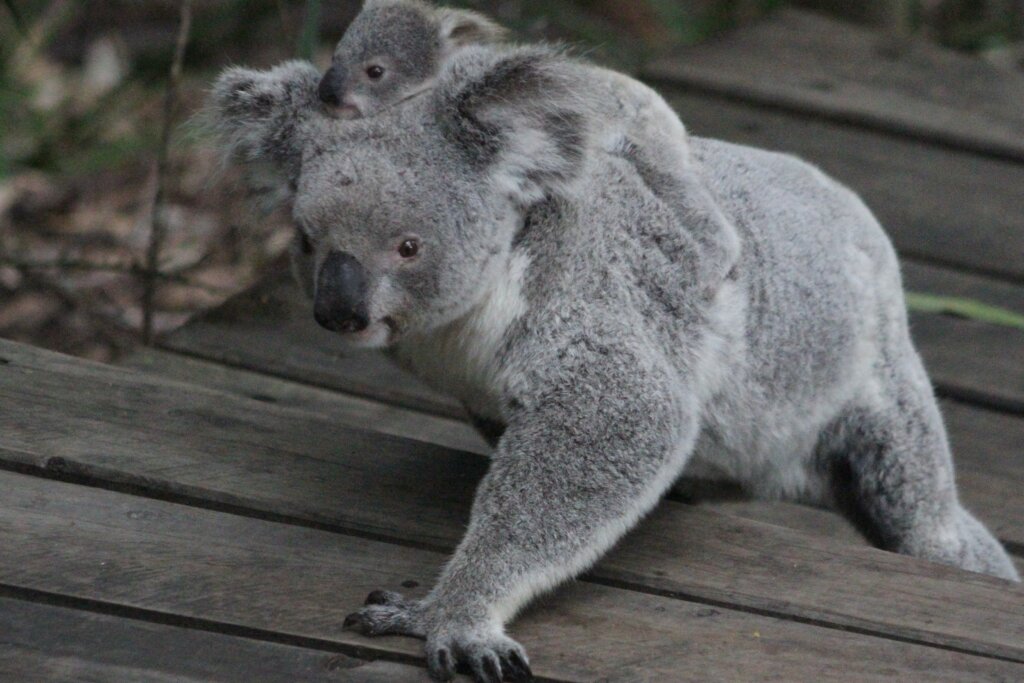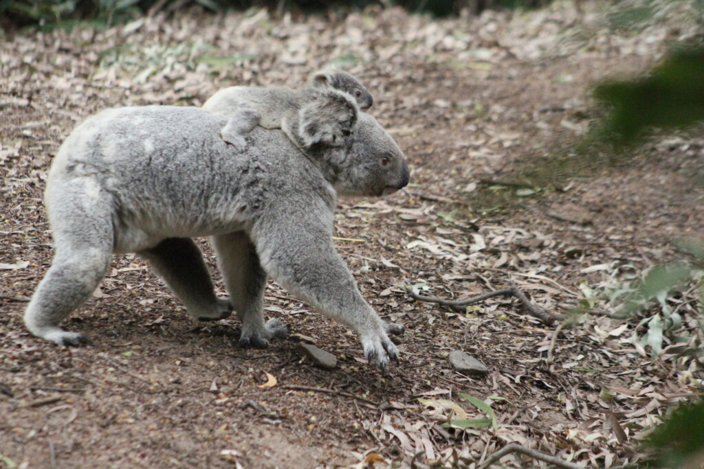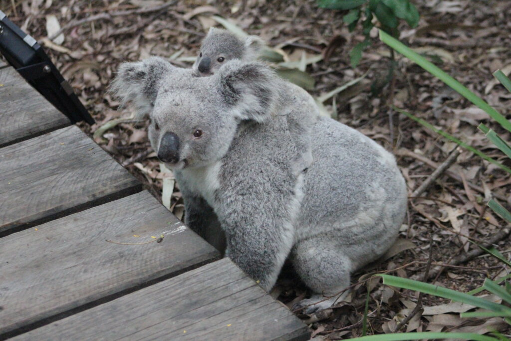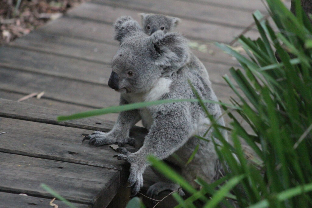 She then climbed onto the boardwalk and started walking, with her baby riding on top of her neck. She stopped, waited, and then hopped off the boardwalk and started hopping away. The German couple and I couldn’t help but laughing – the koalas move so awkwardly.