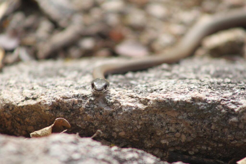 The snake lay still for some time and two people came down the trail from the other direction. I warned them there was a snake and the three of us watched it, chatting about snakes. We weren’t sure what it was but I ended up posting it on my snake identification group on Facebook and someone confirmed it was a juvenile collared whipsnake which is a mildly venomous species of snake. How amazing! The gold band on the juveniles is much more pronounced and it actually fades as they mature.
