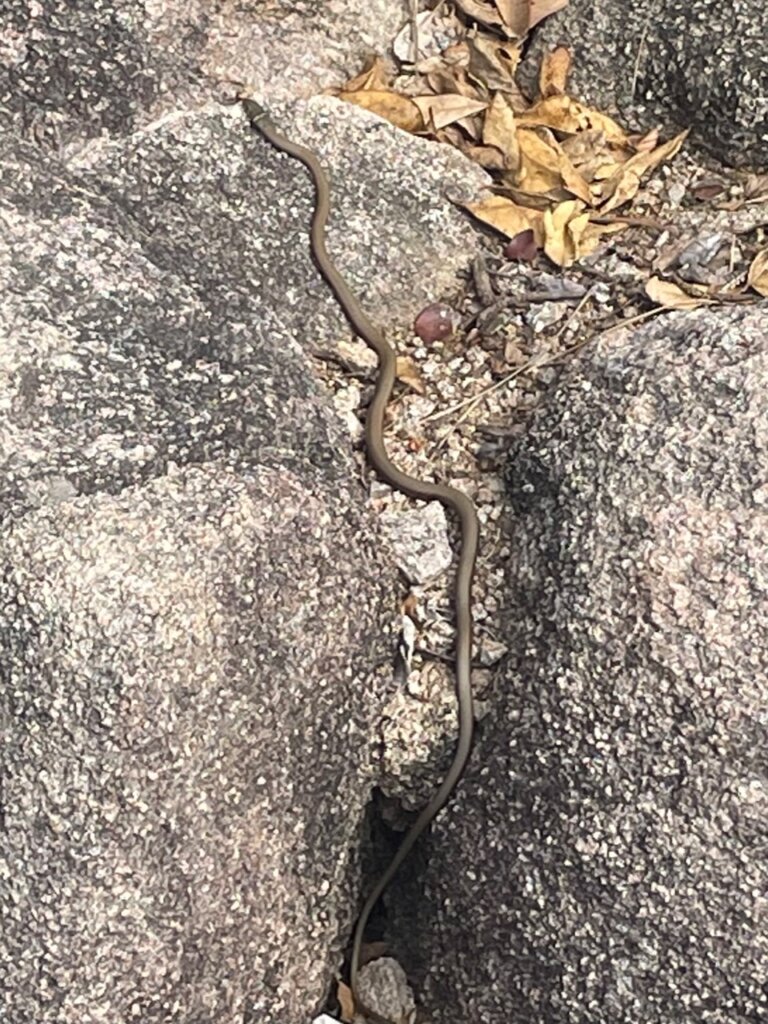 I looked at the time and realized I could finally check into my room – phew! On my ascent back from Balding Bay, I saw something resting on a boulder in the middle of the trail. Is that… A SNAKE?!!