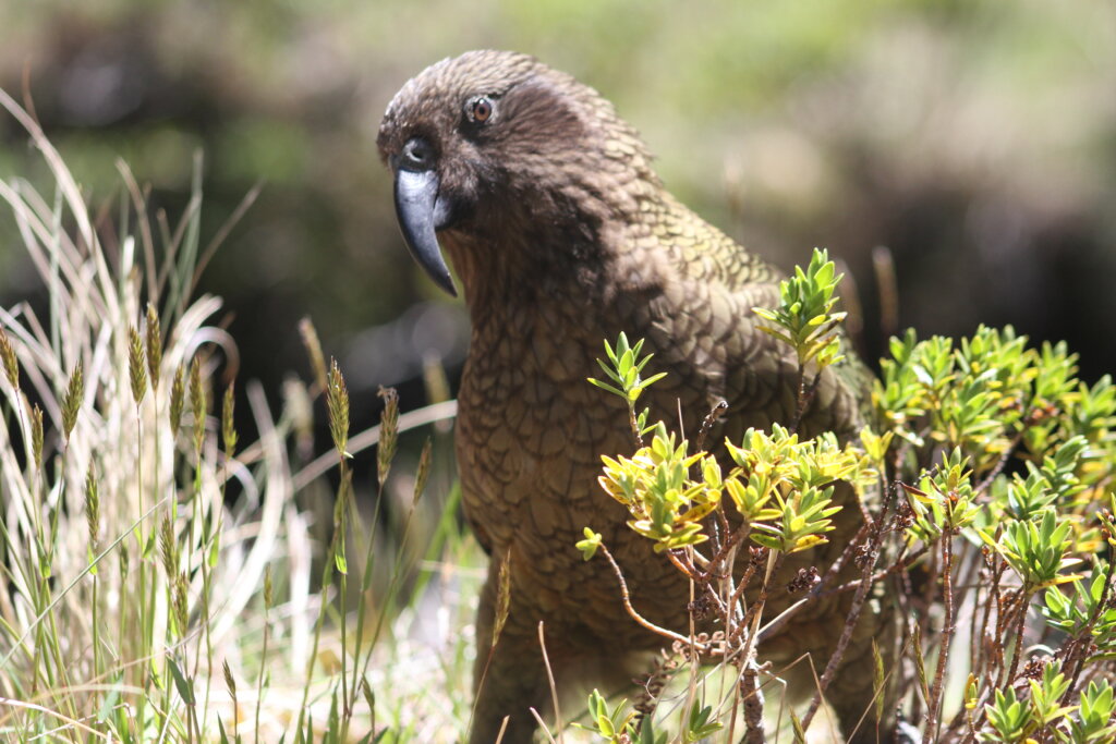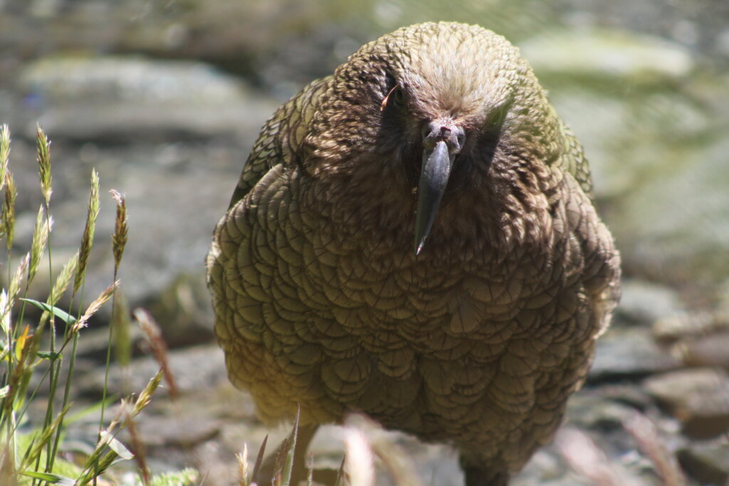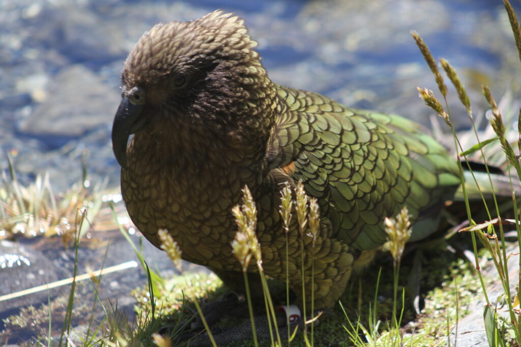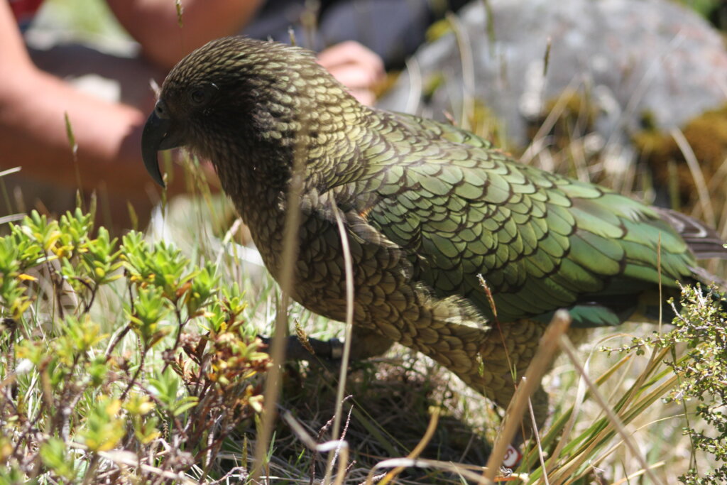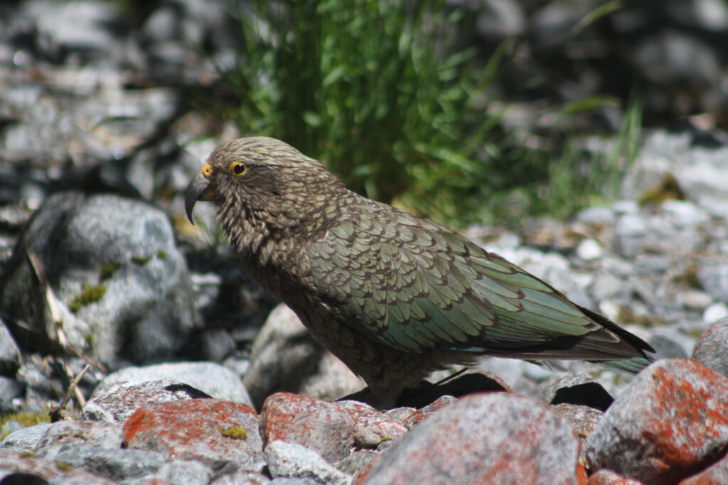 I got out of the bus and was in a hurried frenzy to try to find kea. I didn’t have to try for long. I saw a few people clustered together, then I saw two birds taking flight with beautifully colored feathers. And then… it’s right there! A juvenile kea.
