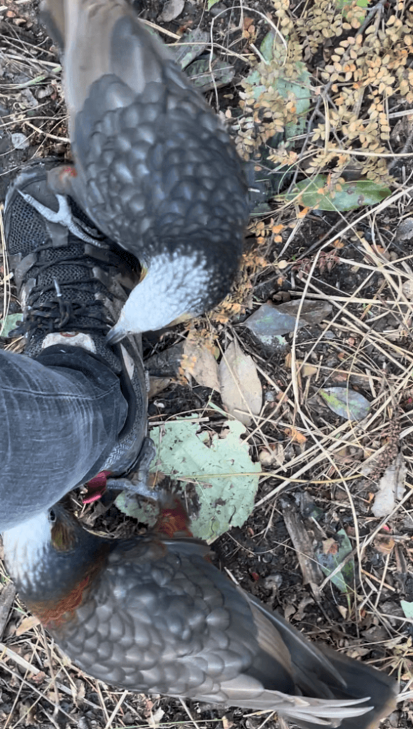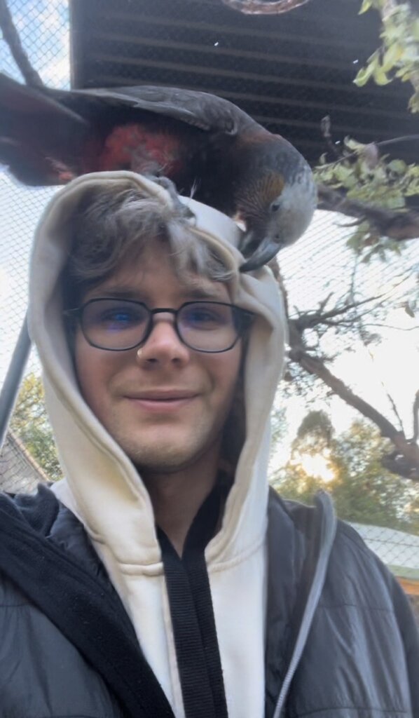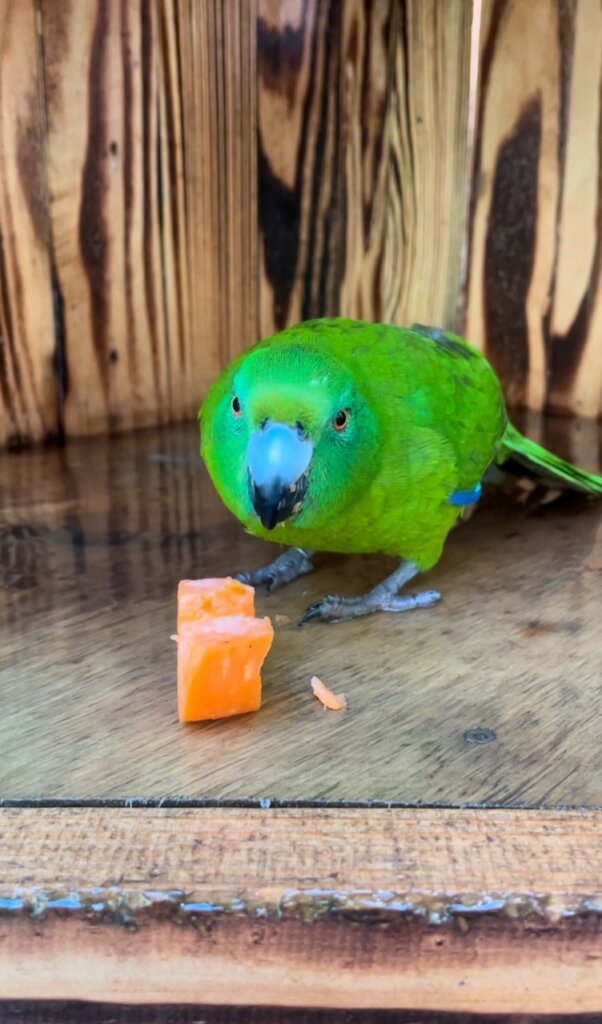 I also got to feed the kaka again. I’d only fed them once before and that was my first day. Back then, they flew onto my head and tried to eat my earring haha. This time, they flew on my head again and tried to get me to take my hood off. One of them was even biting me a little bit! They also were trying to chew at my shoes and then they got mad at each other and tried to fight. Crazy kaka!!!