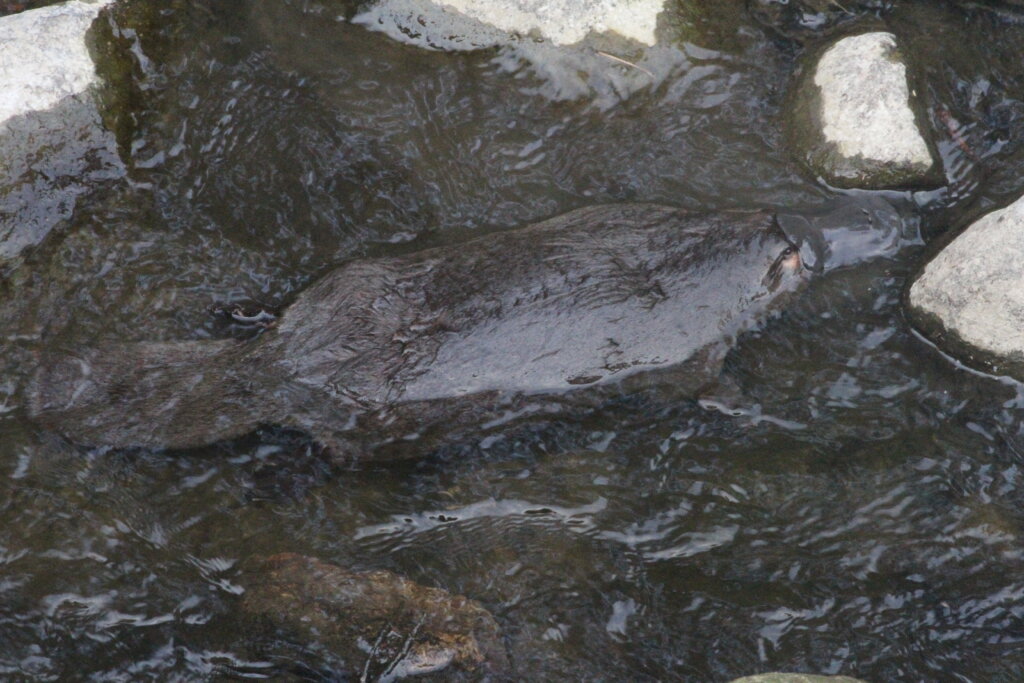 After days of no luck… I found one. Well, an elderly couple had spotted it first. Walking along the rivulet, I was firmly focused on the river. There are a number of small bridges that look over the river and at one of them, a couple was peering down into the water. “Is it a platypus?” I asked as I approached. Sure enough!