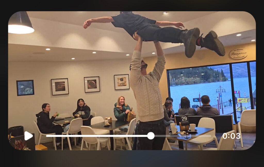 For his final night in Queenstown, we met up at Patagonia with Yinon, Liv, and Akhil. We had hot chocolate and some truffles. It was a really nice time. Before leaving, the “Time of My Life” song from Dirty Dancing started playing. Since Yinon and José practiced acroyoga and balancing so much, José actually did the jump and Yinon caught him, lifting him up towards the ceiling. My parents would have loved that.