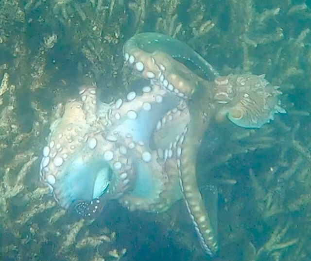 While I had seen octopus quite a few times snorkeling in Australia, there was one encounter that was significant for me and that was in Coral Bay.  After stumbling upon the octopus’ lair, I made a mental note of where the location was and proceeded to visit the spot on most of my snorkeling sessions.  Some days she wasn’t there, other times she was.  Most of the time, she was hiding in a crevice in the large mound of coral but there was one day that was unlike all others.  I approached the coral and saw not one, but two octopus sitting atop it, interacting.  And then… a THIRD octopus!  I couldn’t believe my eyes.  To see octopi linking tentacles, fighting one another, swimming away and inking… it was something I will never forget.  One of my absolute favorite moments in Australia.