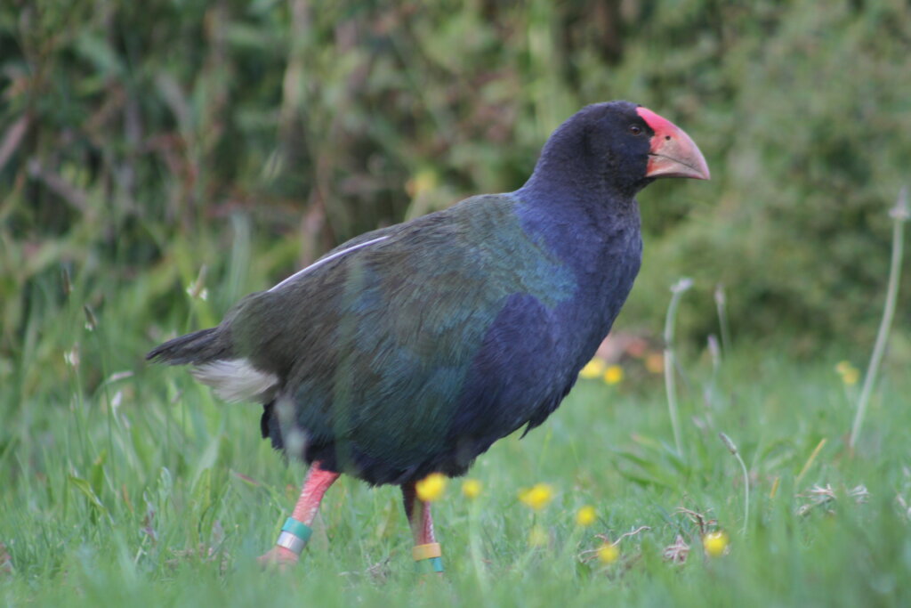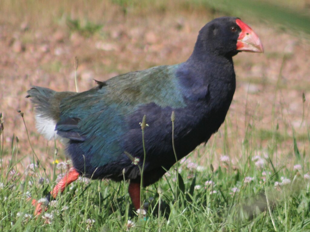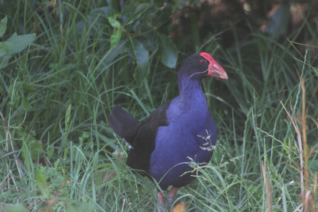 One massive bird remained. The takahē. This was the dad, hoping to distract me from the mother and chick fleeing into the bush. I couldn’t believe it. It was about the size of a chicken and painted with beautiful colors. Red around its beak, a purple-y blue around the head, transitioning to blue, and then green, with small white tuft under its tail. I was able to watch it for maybe one or two minutes before it walked into the bush, joining its partner and child.