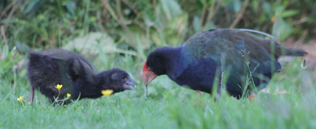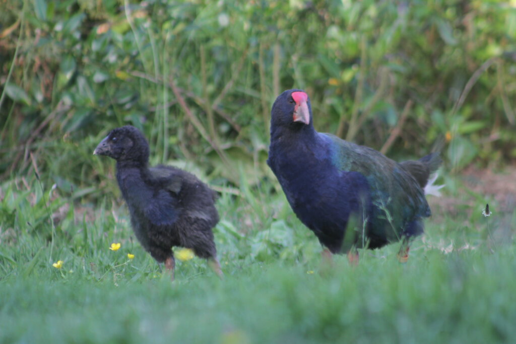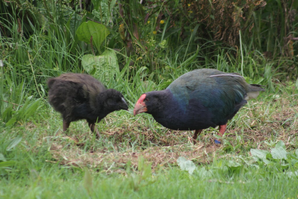 I admired them from afar, snapped some more pictures, and then went to go tell Hayley and Kian, the people staying at the accommodation. When we briefly talked earlier, they’d expressed interest in seeing them. Hayley had been to the island when she was younger and had seen takahē before, but Kian had never seen them. They had been relaxing on the couch but they joined me and watched the takahē for a while.