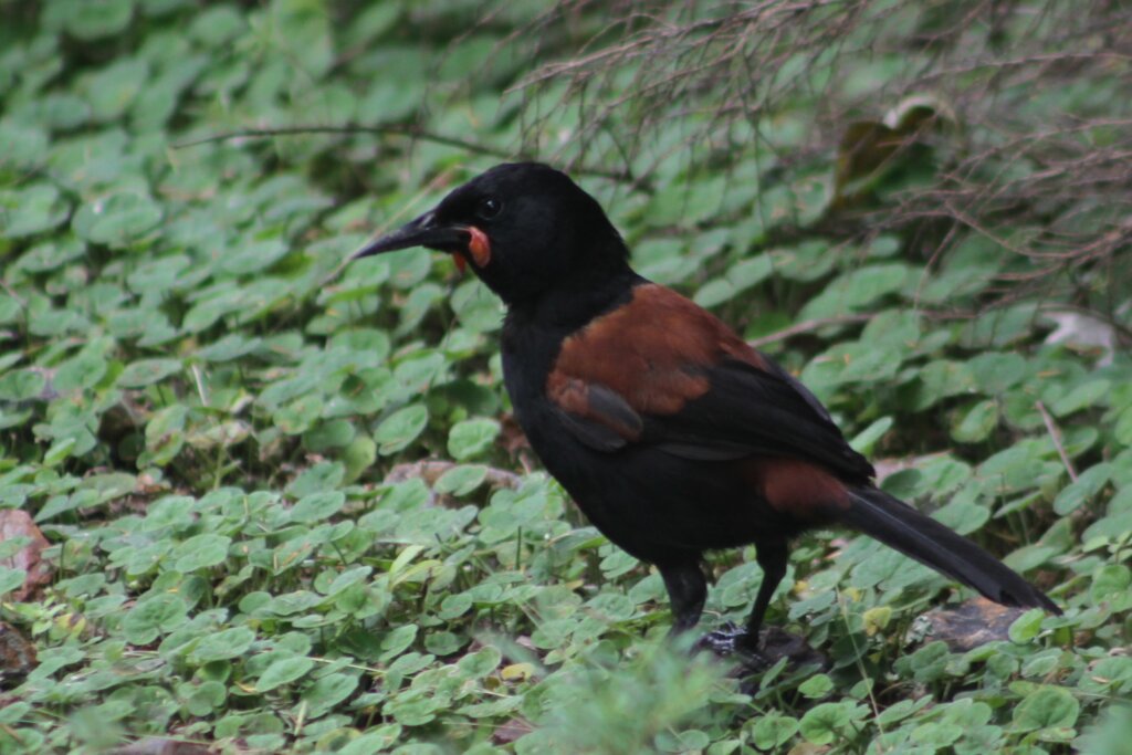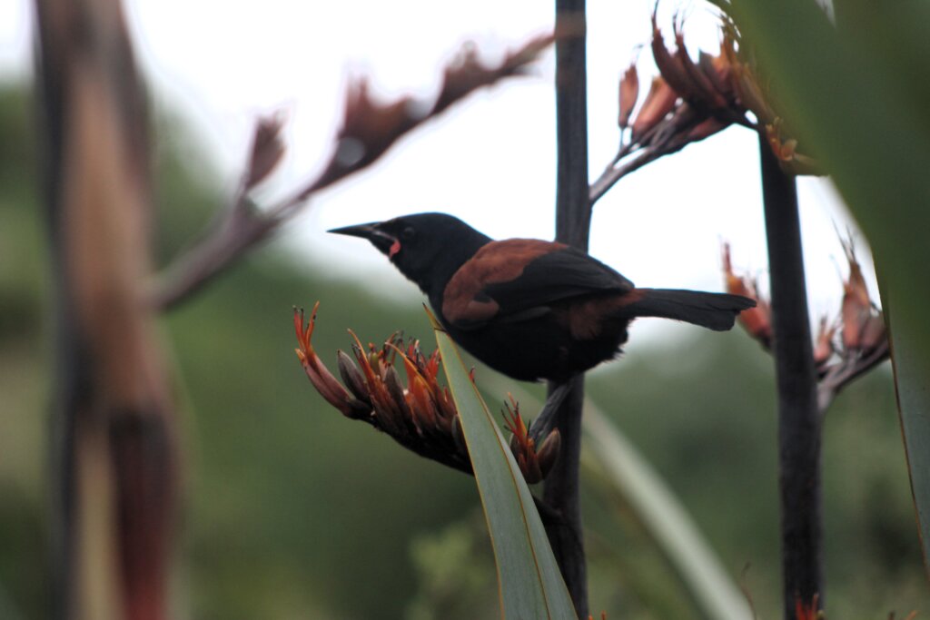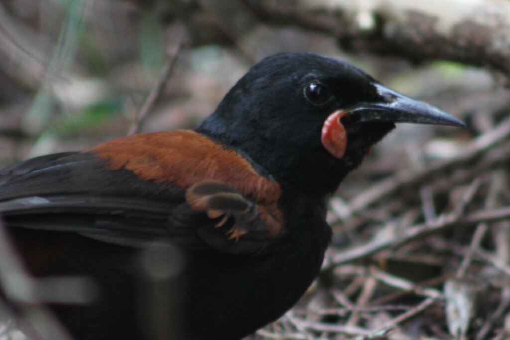 I was really pleased when I got to see two saddleback maybe two feet away from me, hanging out on a tree branch. Because of the rain, they were kind of sheltering and not flying around as much as they normally would. It was cool to observe them with my eyes for a few minutes. Saddlebacks are very striking looking birds. Their feathers are mostly black but they have orange wattles on either side of their beak. They also have a “saddle” of an orange/rust color on their backs, giving them their name. The Māori name for them is tīeke.