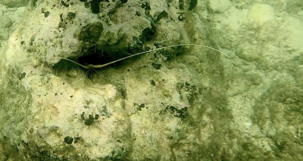 Our second spot was at Cave Cove – not super far from the original snorkeling spot. The area was much different, though, with not as much coral around. On that snorkel, I spotted a pretty large shrimp hiding in a piece of coral. I wasn’t able to see its whole body. It might have been a lobster or prawn? I’m not sure since all I saw were the front of its legs and its antennae.