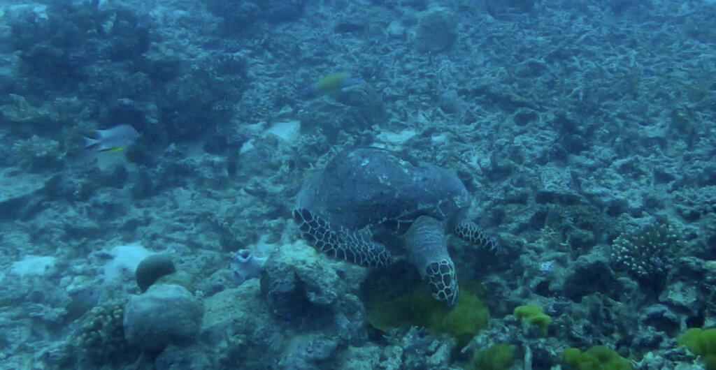We went down to the ocean floor and then started swimming around. Much of the marine life was hiding in the coral, sleeping and trying to avoid nocturnal predators. It was cute to see the eyes of little fish peering back at me, tucked inside the coral. We even saw a sleeping turtle.