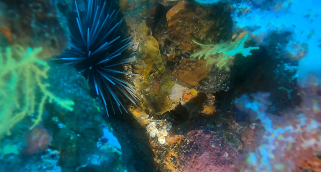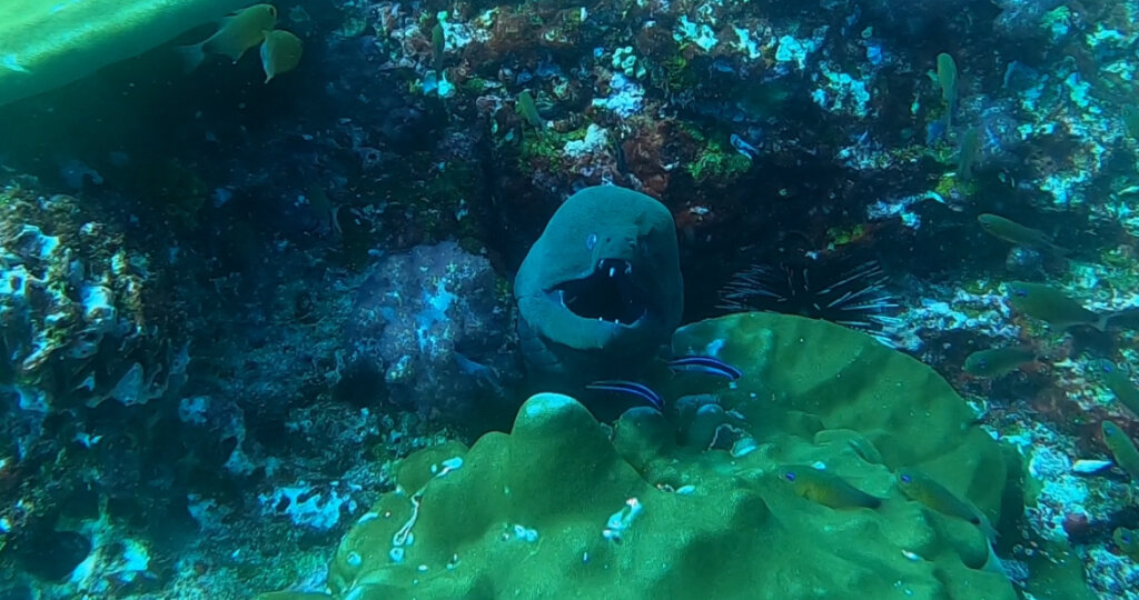 Our first dive of the day was at South East Rock. This was a great dive. I saw four moray eels, which was a record during a single dive for me. But not only that, we were faced with thermocline – which was an experience in and of itself. Thermocline is basically what happens when a current of cold water blows in to meet the warmer water. Google describe it as such: a distinct, thin layer in large bodies of water where temperature changes rapidly with depth, separating warm, mixed surface water from cold, dense deep water. “You’ll be able to see it – it’s like everything goes blurry.” I didn’t understand what that meant when it was vocalized, but when I saw it in person, I understood completely. Truly, it was like we were swimming into a wall of blur. Everything just goes kinda pixelated. And the water gets COLD. Very cold. Goosebumps and shivering cold.