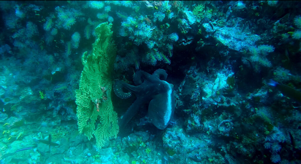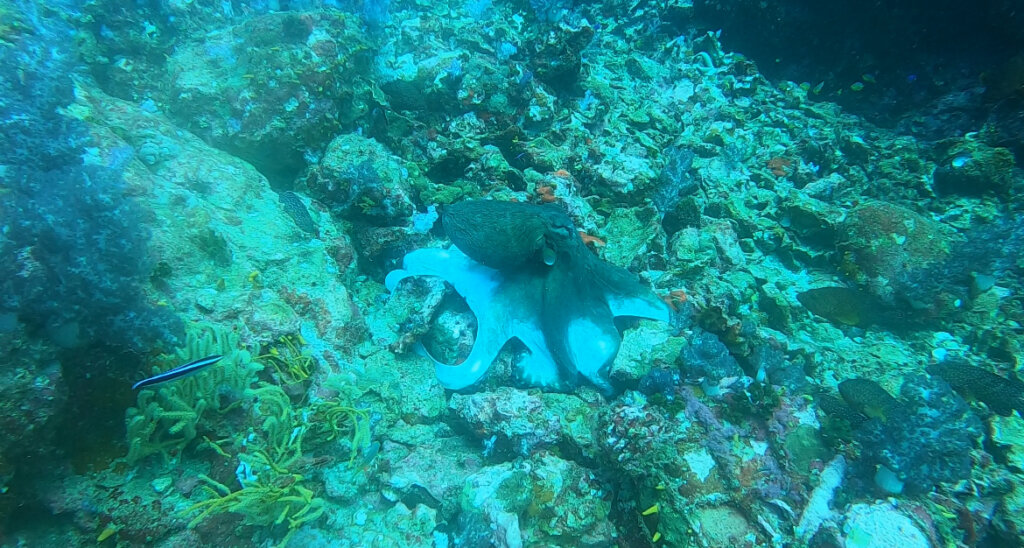 On another dive, I would see the octopus again – but this time, sitting still, camouflaged like the coral it rested atop, unmoving. Divers circled around it, waving their GoPros in its face – some of them getting much too close. The octopus remained unbothered, turned to stone like a victim of Medusa. I felt very lucky that I got to observe the behavior I had, on my own.