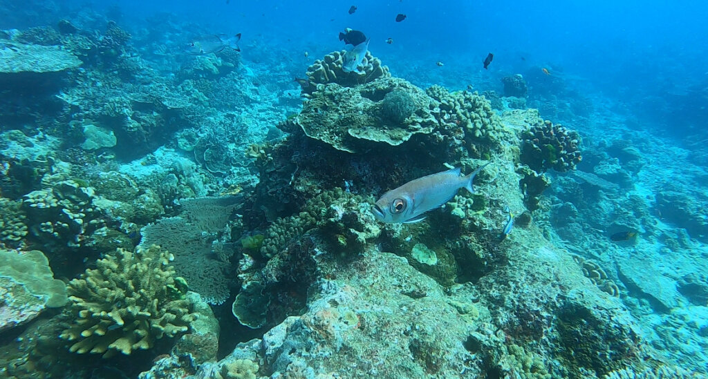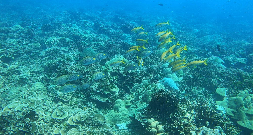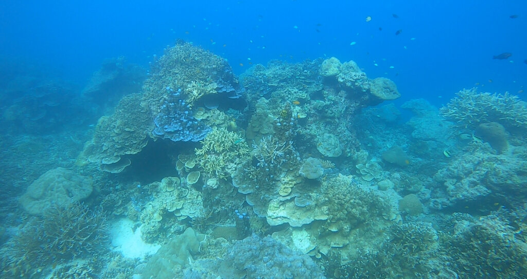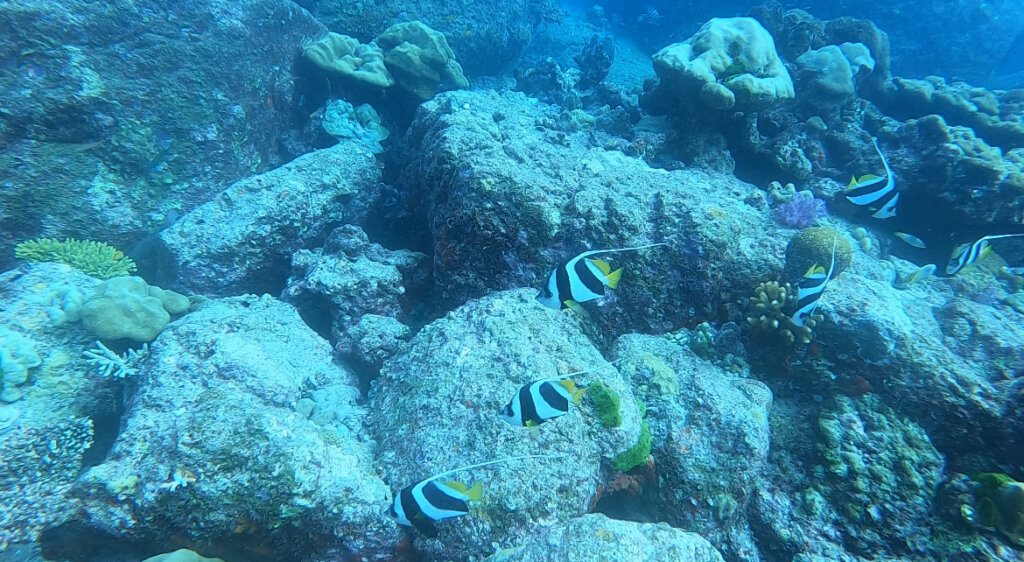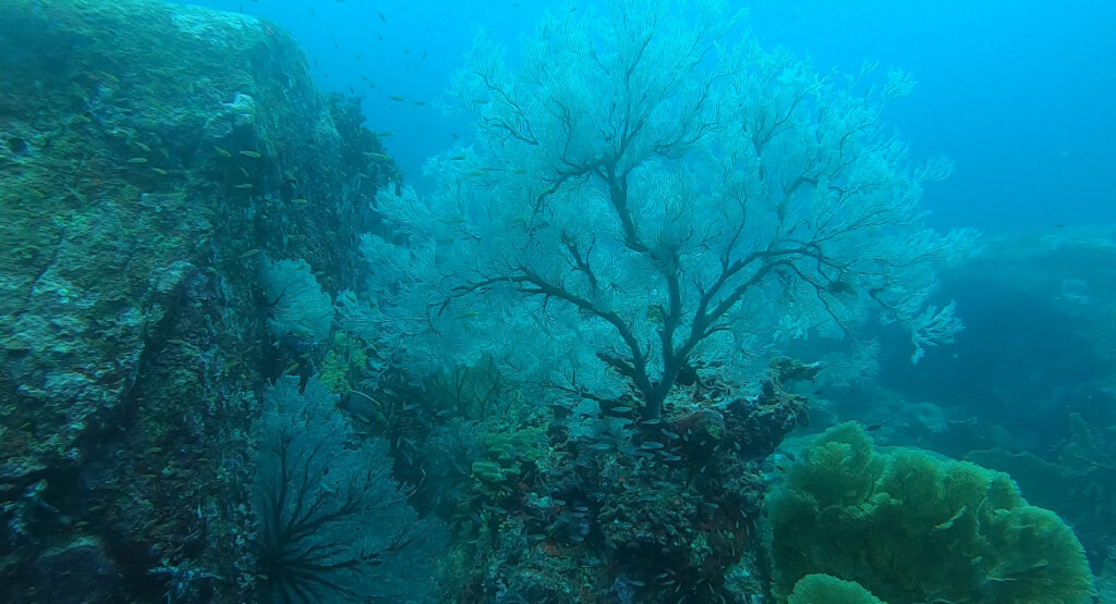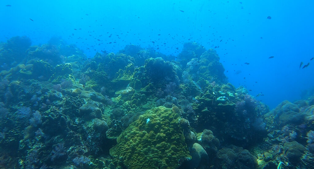 The purpose of the dingy was to bring us closer to the dive site entry. Our boat is too big to safely approach in most cases – so the routine I mentioned above is pretty much how all of our dives went. Once at the dive site, Pang would count us down, “three, two, one, GO!” and we would back-roll into the water, one hand holding our mask and regulator in place, the other on our weight belt and front straps of our BCD.