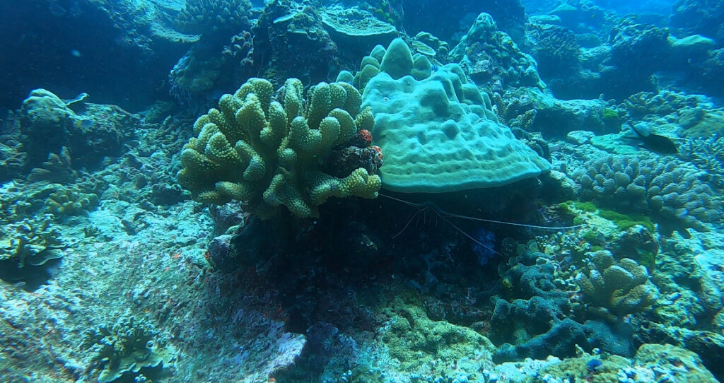 Immediately upon entry, I was amazed by the large schools of fish. That is what Richelieu is famous for – schools of barracuda, tuna, trevally, and more. Never before have I had such massive schools of fish passing me by, passing through me, etc. It was amazing. Pang spotted two ghost pipefish for us – a rare, elusive pipefish. Pipefish are related to seahorses so they have similar looks typically, but ghost pipefish are in a league of their own, adorned in an unusual spiky look. They’re very cool! (Seen in middle photo below.)