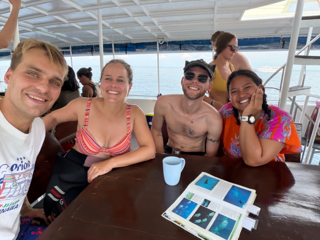 Overall, the ship was exceptional. The bottom level had all our dive equipment port-side, in addition to everyones’ cabins. The middle level had the dining/briefing area, stocked in perpetuity with bananas, clementines, and biscuits. Stairs led up to the top level, with mats at the front for sunbathing, a shaded area in the middle with hammocks and bean bags, and another sunbathing area in the back. It was a great ship!