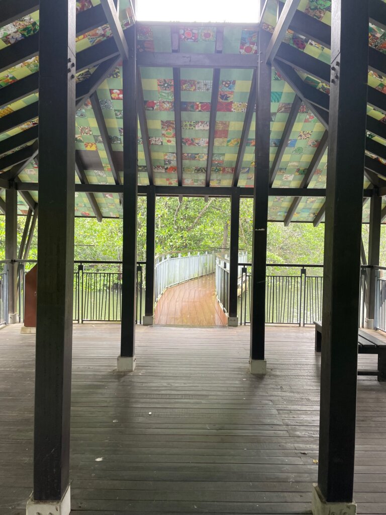 By the time I arrived at the mangroves, it started to rain. HARD. I sought shelter in a spot with benches. I laid down and looked up at the ceiling. On the ceiling were Sungei-Buloh related themes painted on square wood tiles, presumably by children. Cute. I ended up trying to have a nap while the rain poured down around me. At least I was dry.