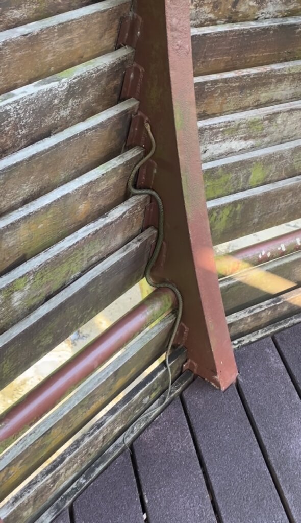 I re-corrected my route and wound up on a cool part of the trail where I was on a highly elevated boardwalk. I kept scanning over the edges and… sure enough, I was able to spot another snake!