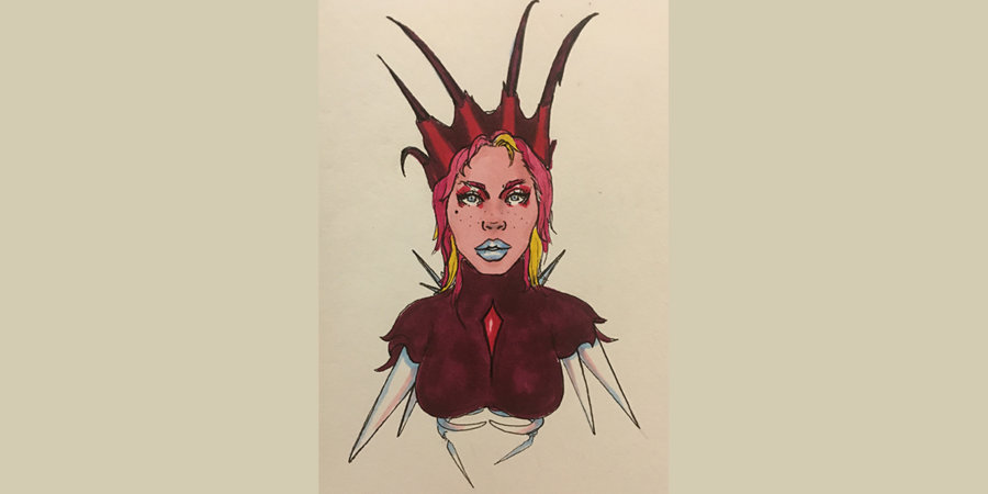 color drawing of a woman with spikes sprouting from her shoulders, torso, and skull