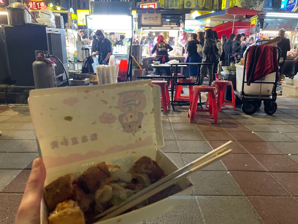 I capped off my first (long) day in Taipei by checking out the Ningxia night market. It wasn’t as large as some of the other markets, but a LOT of people were there eating food. I tried a couple of things that first night. First, I had stinky tofu, which… really, really smells. It’s stinky! I met some other travelers who were so put off by the smell, they didn’t want to try it. However, despite the weird smell of it cooking, it tasted amazing. (And once you know what the smell is, you smell it everywhere.)