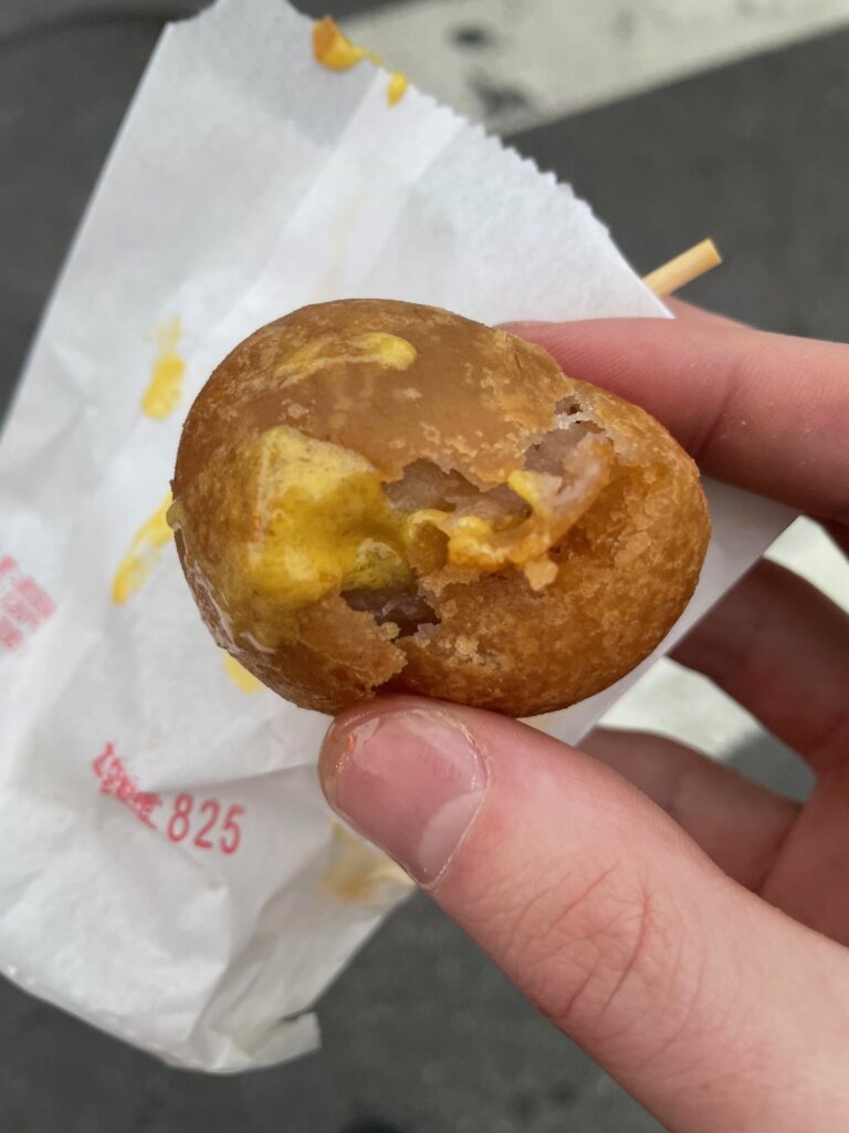 I also had an exploding egg yolk fried taro ball. It is honestly one of the best things I’ve ever tasted. It’s basically… I guess an egg yolk inside what I’m guessing is pulverized taro molded in the shape of a ball, and then they deep fry it? I have no idea. That vendor was the only person who sold it. I went to a number of night markets in Taipei and that was the only stall. It was divine.