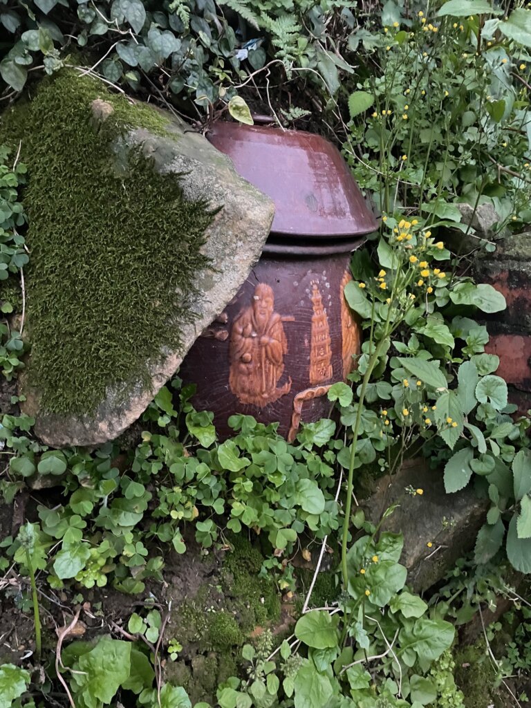 (Left: an urn from a cemetery I walked through, right: one of the climbing paths back up to Jiufen)
