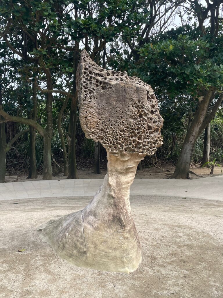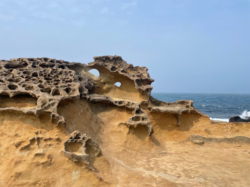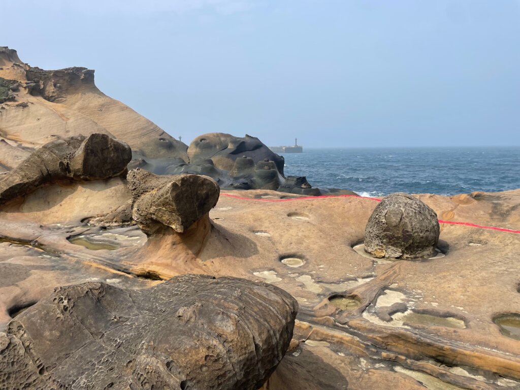 Yehliu Geopark is special because the sea has eroded pieces of the land into some very unusual shapes. There were some formations that looked like giant mushrooms. Others got very skinny in the middle and then had a massive boulder on top. One was shaped like a shoe (I didn’t see that one, but saw a picture afterwards lol). There are also old fossils of sea dollars, etc.