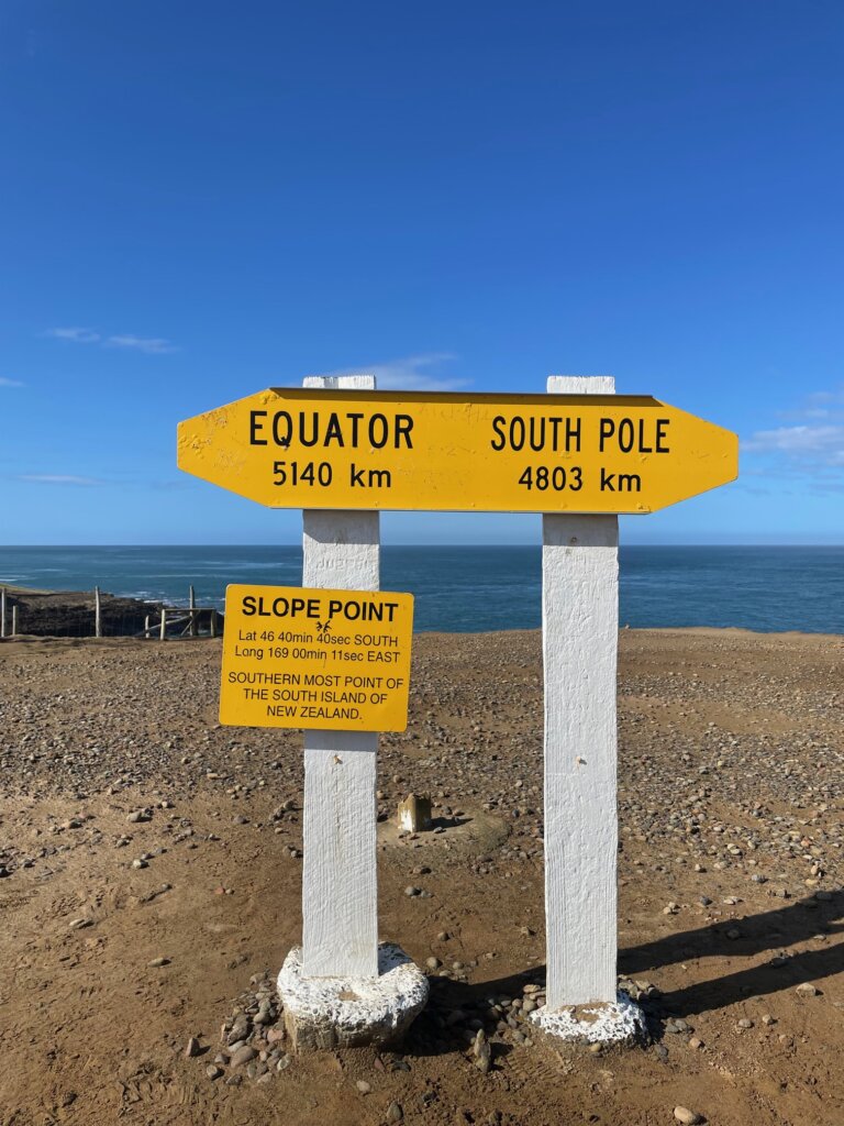 Slope Point is marked by a sign that shows the distance to the Equator and the distance to the South Pole. How cool is that?