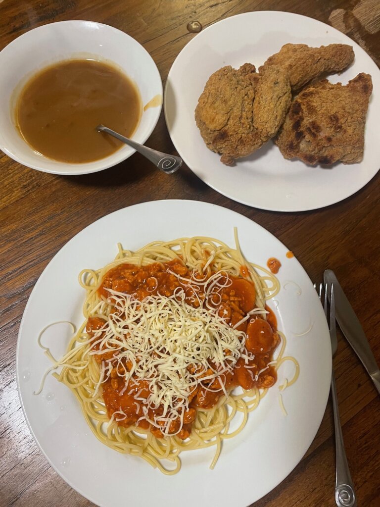 Yvonne made dumplings as an appetizer, and then Filipino Spaghetti – which is basically like regular spaghetti, but it’s much sweeter, and also has ground pork and pieces of hot dog. Very yummy! We also had fried chicken with gravy. It was absolutely delicious, but the three of us were stuffed afterwards.