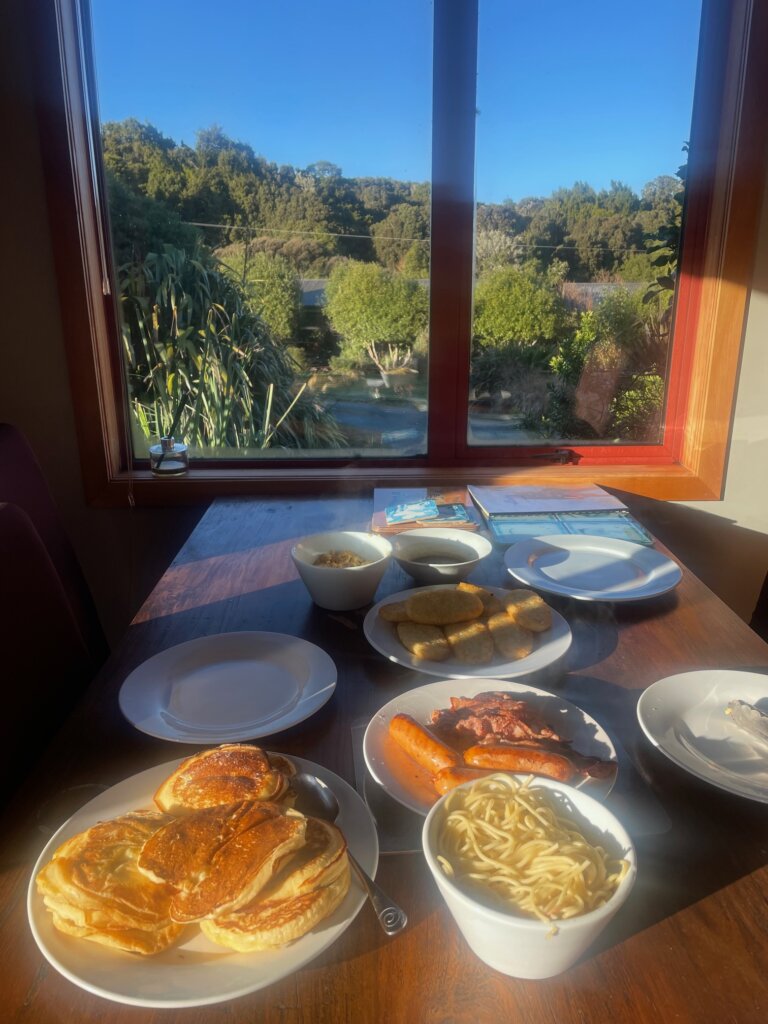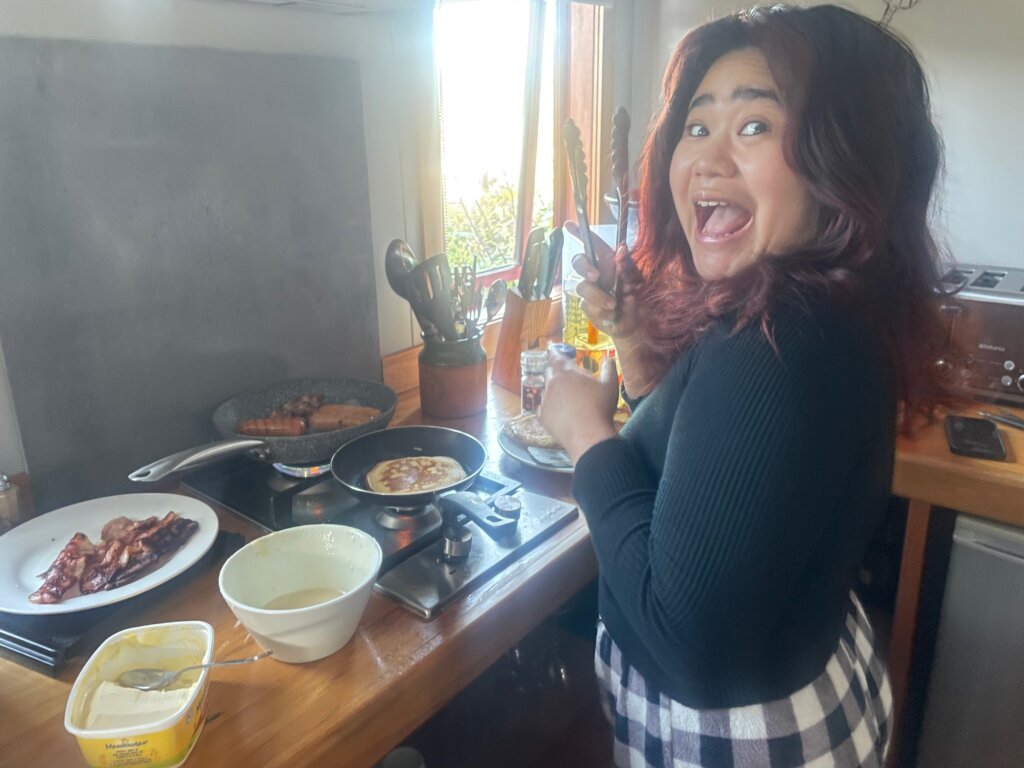 We woke up at 8am. Yvonne cooked up a storm for us. We had pancakes, hash browns with the leftover gravy, sausages, bacon, eggs, leftover Filipino Spaghetti. It was a total feast. But it set us up super well for the day. With the porch door open, the sun shone its morning light on us as we shared breakfast together.