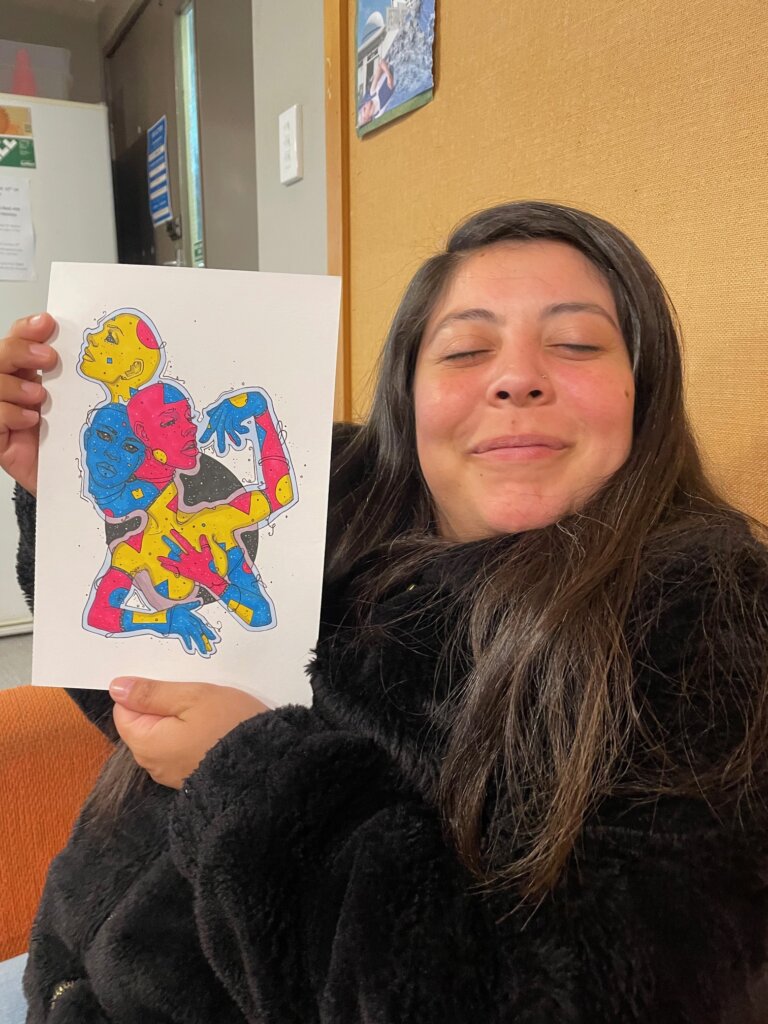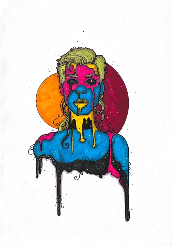 I have been meaning to do one for a while. I thought the last one I’d done was in Cape Tribulation but as I’m typing this, I realize I actually drew a self-portrait my final day in Australia. Still – it is time. I’ve been keen to draw one in the new paint-drip style I’ve been exploring. Here it is! My main disappointment is that I made the shoulders too wide, the black not drippy on the chest, and the eyes too big. One day, I’ll get it right!