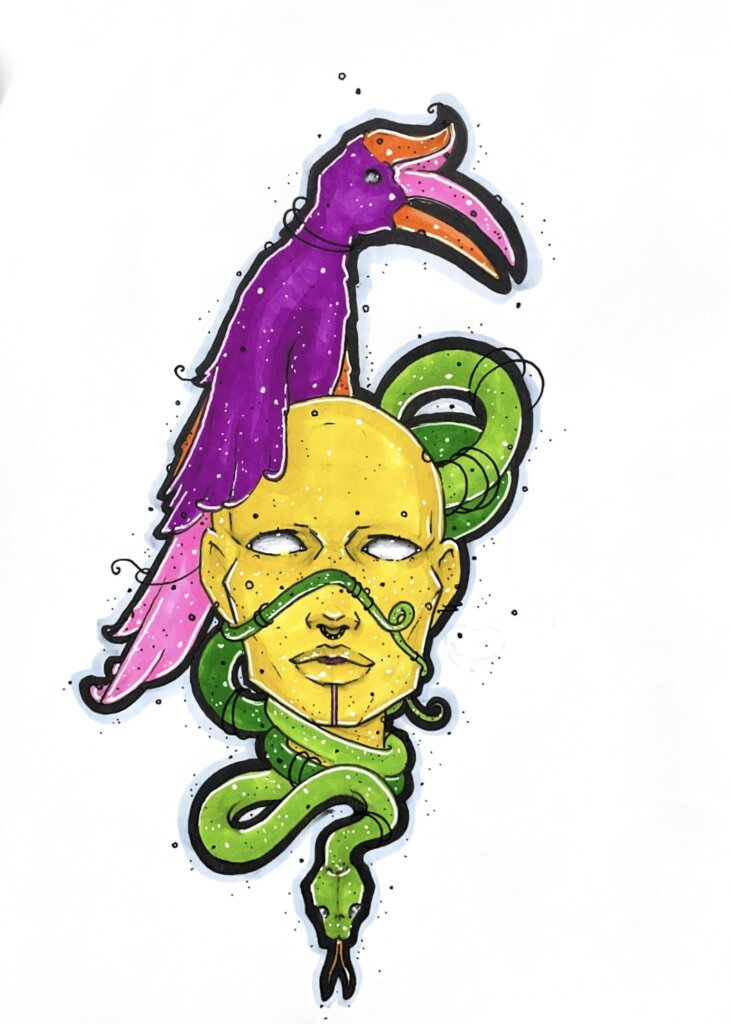I LOVE this piece. Combining the rhinoceros hornbill with a python was such a solid idea. I feel this has laid the foundation for a whole new series I’d like to explore – people + wildlife. I’m really happy with how the human face turned out, the curvature of the snake, and the hornbill. If anything, I’d maybe like to refine the rhino part of the hornbill’s beak, but that’s already. Nothing can be perfect. Very pleased with this, though. I actually ended up finally changing my phone background from the last piece that I was really happy with, which was from basically a year ago.