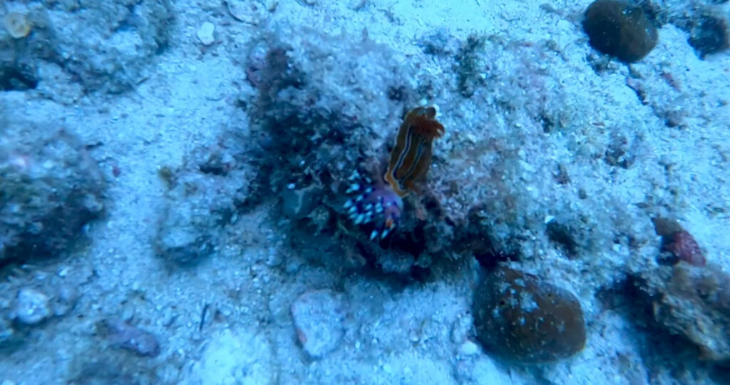 Our guide, Ben, found two nudibranchs and he actually went to pick one up and place it near the other one. As he was doing so, the curious pufferfish came over to inspect what he was doing and tried to bite the nudibranch out of Ben’s hand. He managed to get it away and reunited the nudibranchs. Cool! One of these days, I need to get a better underwater camera because I’d love to get close-up shots of nudibranchs. They’re such beautiful creatures and the details really show up well with a macro lens.