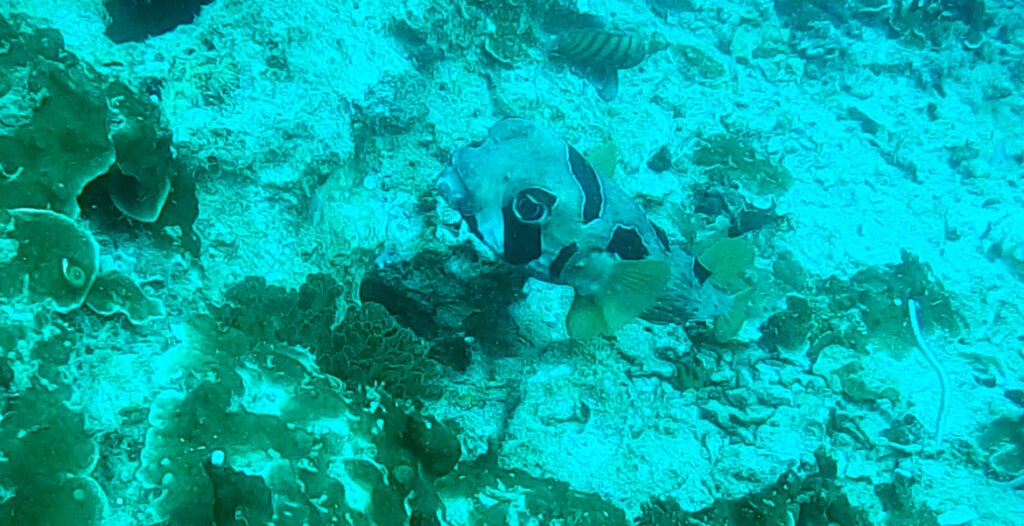 There was also a massive pufferfish hanging near us a lot of the time – its teeth were huge and it was not afraid of the divers at all. At one point, it swam right towards me. I thought it was going to take a bite out of me. I was more afraid of that than the sharks!