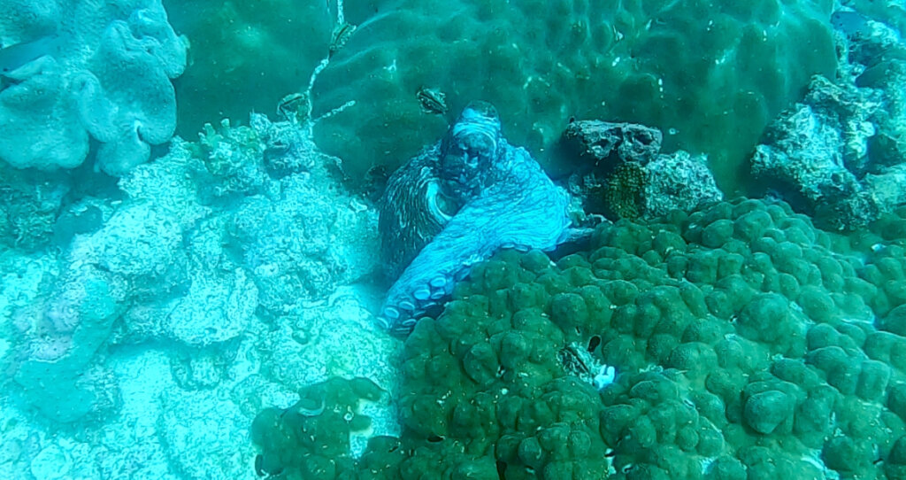 From there, we boarded the boat, had a break, and then were already on our second dive at Malang Rock. This dive had a lot of luscious coral gardens and some great wildlife. We saw a moray eel, the largest nudibranchs I’ve ever seen, the largest and most beautiful JELLYFISH I’ve ever seen, and… an octopus. This is the first time I’ve ever seen an octopus on a dive. I’ve only ever seen octopi while snorkeling prior. It was pretty shy and didn’t like us crowding around it – but it was cool to observe it and see it changing colors as it started to retreat into its cave.
