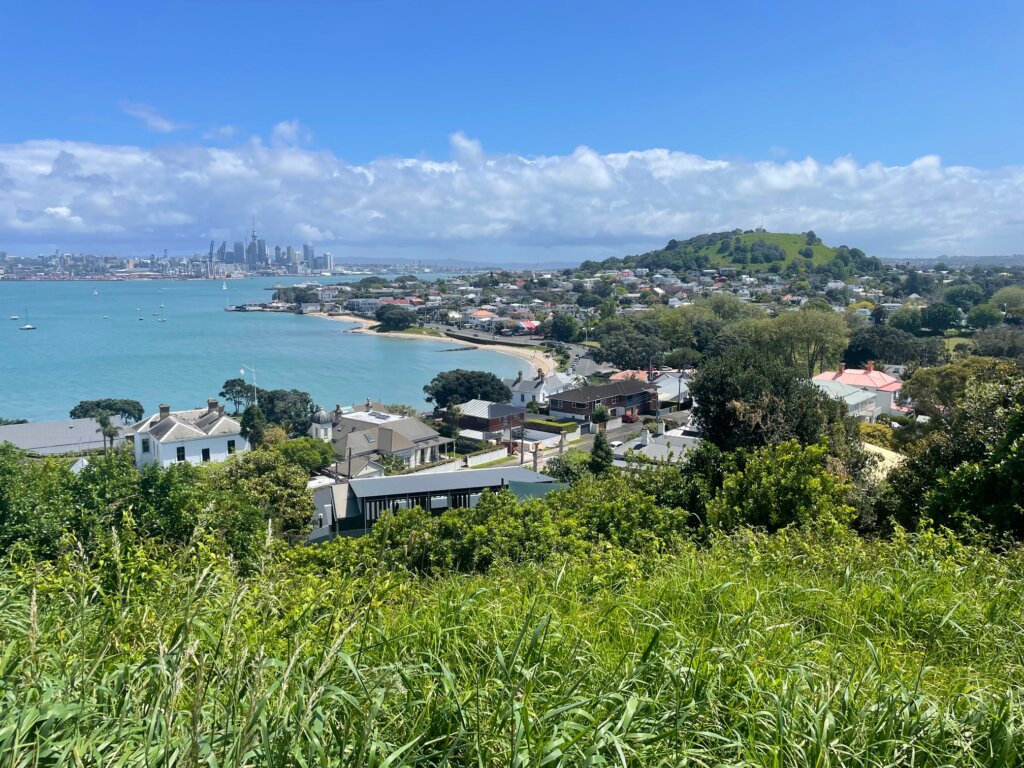 After the bunkers, the three of us climbed to the top of the hill. We had the view of downtown Auckland on one side and the view of Rangitoto on the other.